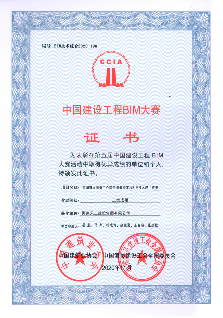 河南省第三届匠心杯工程建设BIM技术应用大赛三等成果奖