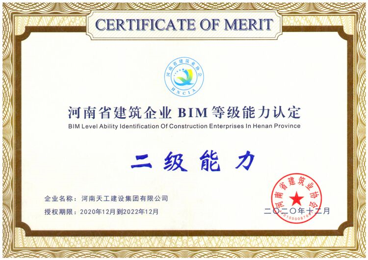 近日,河南省建筑业协会下发豫建协〔2020〕102号文《关于公布2020年河南省建筑企业“具备BIM技术应用能力”等级认定结果的通知》,河南天工建设集团有限公司BIM能力被认定为“河南省建筑企业BIM等级能力认定二级能力”。